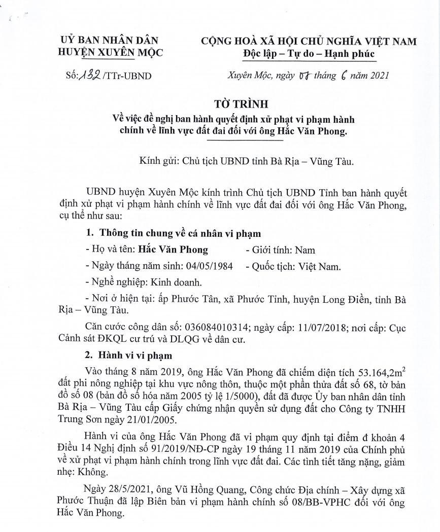 Ngày 7/6/2021, UBND huyện Xuyên Mộc đã có tờ trình gửi UBND tỉnh Bà Rịa – Vũng Tàu về việc xử lý vi phạm hành chính đối với ông Hắc Văn Phong. Theo đó, ông Hắc Văn Phong đã có hành vi lấn chiếm hơn 5,3ha quyền sử dụng đất đã cấp cho Công ty Trung Sơn, thẩm quyền xử phạt vi phạm hành chính thuộc UBND tỉnh Bà Rịa – Vũng Tàu nên UBND huyện Xuyên Mộc đề nghị UBND tỉnh ra quyết định xử phạt hành chính theo thẩm quyền.