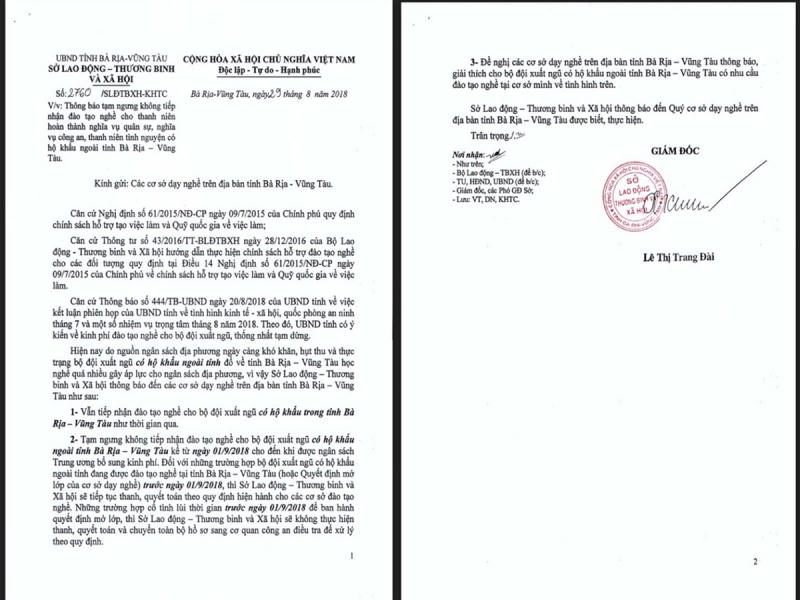 Trước đó, ngày 29/08/2018 Sở Lao động Thương binh và xã hội tỉnh Bà Rịa – Vũng Tàu ban hành thông báo số 2760/SLĐTBXH-KHTC thông báo về việc tạm ngưng không tiếp nhận đào tạo nghề cho thanh niên hoàn thành nghĩa vụ quân sự, nghĩa vụ công an, thanh niên tình nguyện có hộ khẩu ngoài tỉnh BR-VT kể đầu từ ngày 01/09/2018.