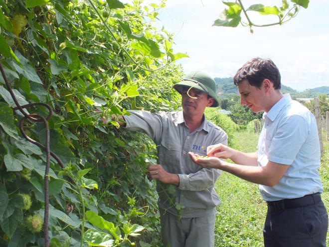 | Anh Pierrick Bon, Giám đốc Kỹ thuật của TH Herbal kiểm tra cảm quan nguyên liệu lạc tiên trước khi thu hái |