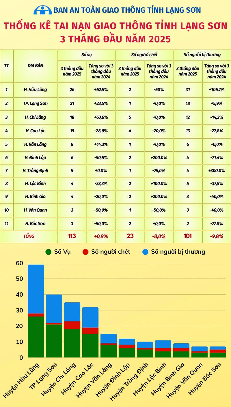 Theo Ban An toàn giao thông tỉnh Lạng Sơn, trong ba tháng đầu năm 2025, toàn tỉnh xảy ra 113 vụ tại nạn giao thông, làm 23 người chết, giảm 8% so với 3 tháng đầu năm 2024, 101 người bị thương, giảm 9,8% so với cùng kỳ năm ngoái.