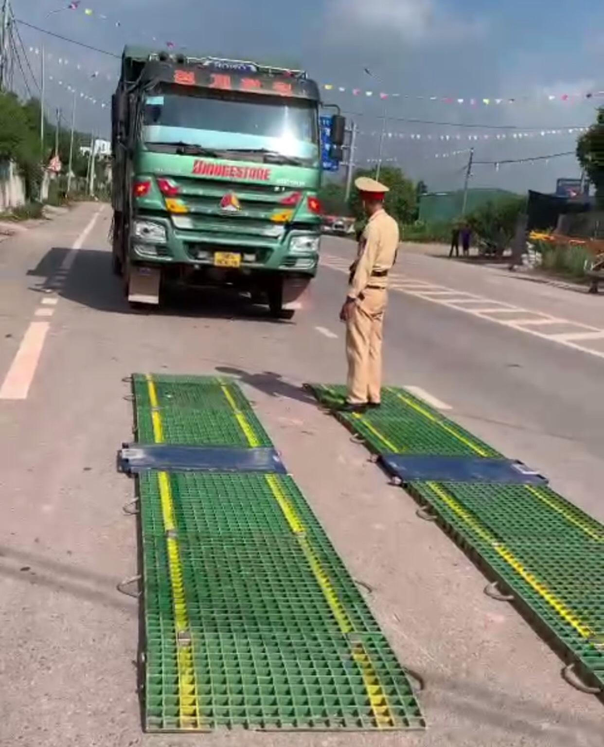 Công an huyện Lạng Giang đang tiến hành cân kiểm tra tải trọng xe |