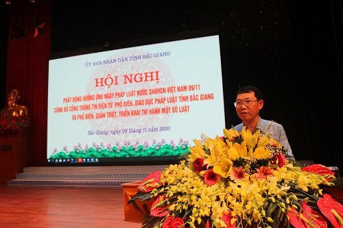 (PLVN) -Hưởng ứng các hoạt động tổ chức Ngày Pháp luật năm 2020, chiều ngày 9/11/2020, UBND tỉnh Bắc Giang tổ chức Hội nghị trực tuyến ở 03 cấp phát động hưởng ứng Ngày Pháp luật nước CHXHCN Việt Nam 9/11, công bố khai trương Cổng thông tin điện tử phổ biến, giáo dục pháp luật tỉnh Bắc Giang và quán triệt việc thi hành Luật sửa đổi, bổ sung một số điều của Luật Ban hành văn bản quy phạm pháp luật, Luật Hòa giải, đối thoại tại Tòa án.