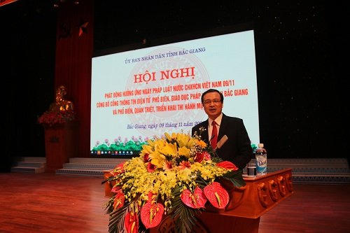 Ứng dụng công nghệ thông tin và đa dạng hóa các hình thức phổ biến giáo dục pháp luật là nhiệm vụ quan trọng được Bộ Tư pháp, UBND tỉnh Bắc Giang chú trọng chỉ đạo tổ chức triển khai thực hiện thông qua việc ban hành các Chương trình, Đề án và văn bản khác. Cũng tại Hội nghị, UBND tỉnh đã công bố khai trương chính thức Cổng thông tin điện tử phổ biến, giáo dục pháp luật tỉnh Bắc Giang, đây chính là điểm nhấn nổi bật trong chuỗi hoạt động hưởng ứng Ngày Pháp luật 9/11 năm nay. Cổng thông tin điện tử phổ biến, giáo dục pháp luật sẽ đăng tải đầy đủ, toàn bộ các văn bản chỉ đạo, nhân lực thực hiện, tài liệu tuyên truyền và các hoạt động PBGDPL từ trung ương đến cơ sở.