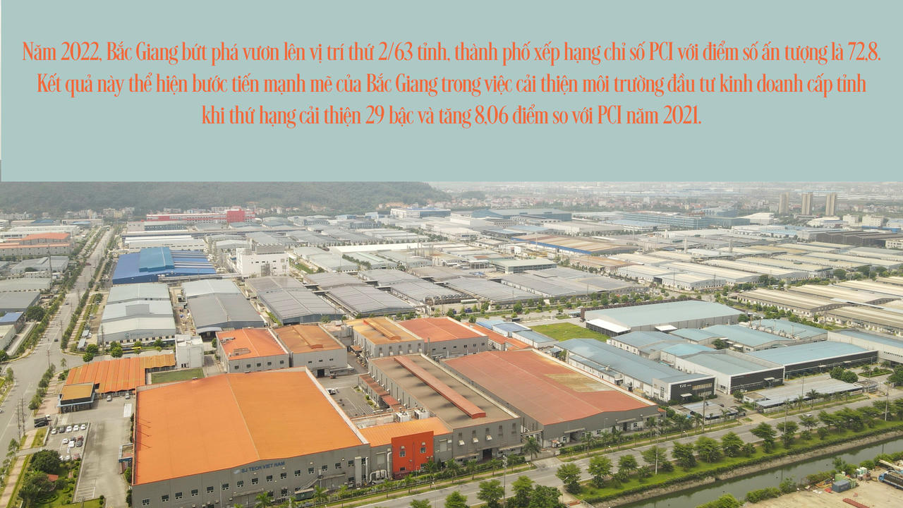 Năm 2022, Bắc Giang bứt phá vươn lên vị trí thứ 2/63 tỉnh, thành phố xếp hạng chỉ số PCI với điểm số ấn tượng là 72,8. Kết quả này thể hiện bước tiến mạnh mẽ của Bắc Giang trong việc cải thiện môi trường đầu tư kinh doanh cấp tỉnh khi thứ hạng cải thiện 29 bậc và tăng 8,06 điểm so với PCI năm 2021. Chỉ số PAR INDEX năm 2022 Bắc Giang đạt 88,54/100 điểm, xếp thứ 4/63 tỉnh, thành phố, tăng 3 bậc so với năm trước. Chỉ số SIPAS xếp thứ 44/63 tỉnh, thành phố (năm 2021 xếp thứ 8/63 tỉnh, thành phố).