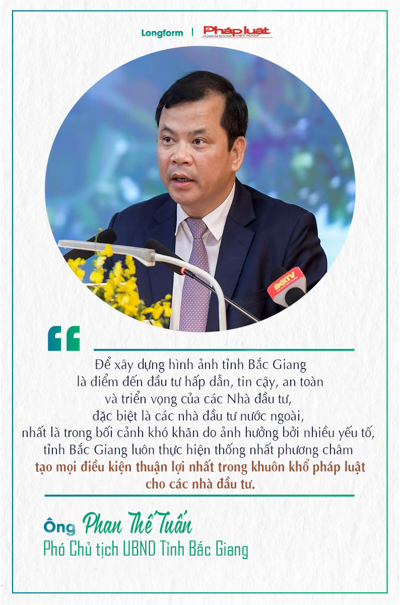 (PLVN) - Hàng tỷ USD vốn đầu tư nước ngoài (FDI) đổ về Bắc Giang khiến nhiều chuyên gia kinh tế gọi đây là một “hiện tượng”, một cạnh quan trọng trong “tam giác FDI” phía Bắc, “Thủ phủ” mới của dòng vốn FDI. Điều gì đã khiến Bắc Giang có sự bứt tốc ngoạn mục này, Báo Pháp luật Việt Nam đã có cuộc trao đổi với Phó Chủ tịch UBND tỉnh Bắc Giang Phan Thế Tuấn.