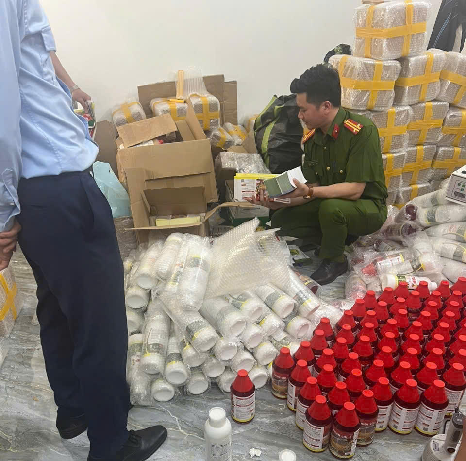 Lực lượng chức năng kiểm tra tang vật là thuốc bảo vệ thực vật giả các loại. |