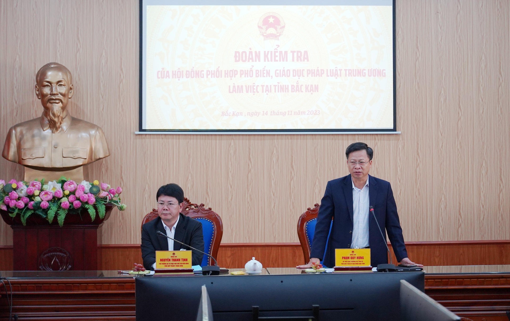 Thay mặt Đoàn kiểm tra, Thứ trưởng Bộ Tư pháp Nguyễn Thanh Tịnh, Phó Chủ tịch Hội đồng phối hợp PBGDPL Trung ương ghi nhận và đánh giá cao những kết quả mà Hội đồng phối hợp PBGDPL tỉnh Bắc Kạn đã đạt được. Thứ trưởng Nguyễn Thanh Tịnh đề nghị Hội đồng tỉnh tiếp tục phát huy vị trí, vai trò, trách nhiệm của Hội đồng phối hợp PBGDPL các cấp nói chung, trách nhiệm của các cơ quan thành viên Hội đồng nói riêng trong triển khai thực hiện công tác PBGDPL. Chủ động nắm bắt, tháo gỡ khó khăn, vướng mắc thực tiễn trong công tác PBGDPL trên địa bàn tỉnh.