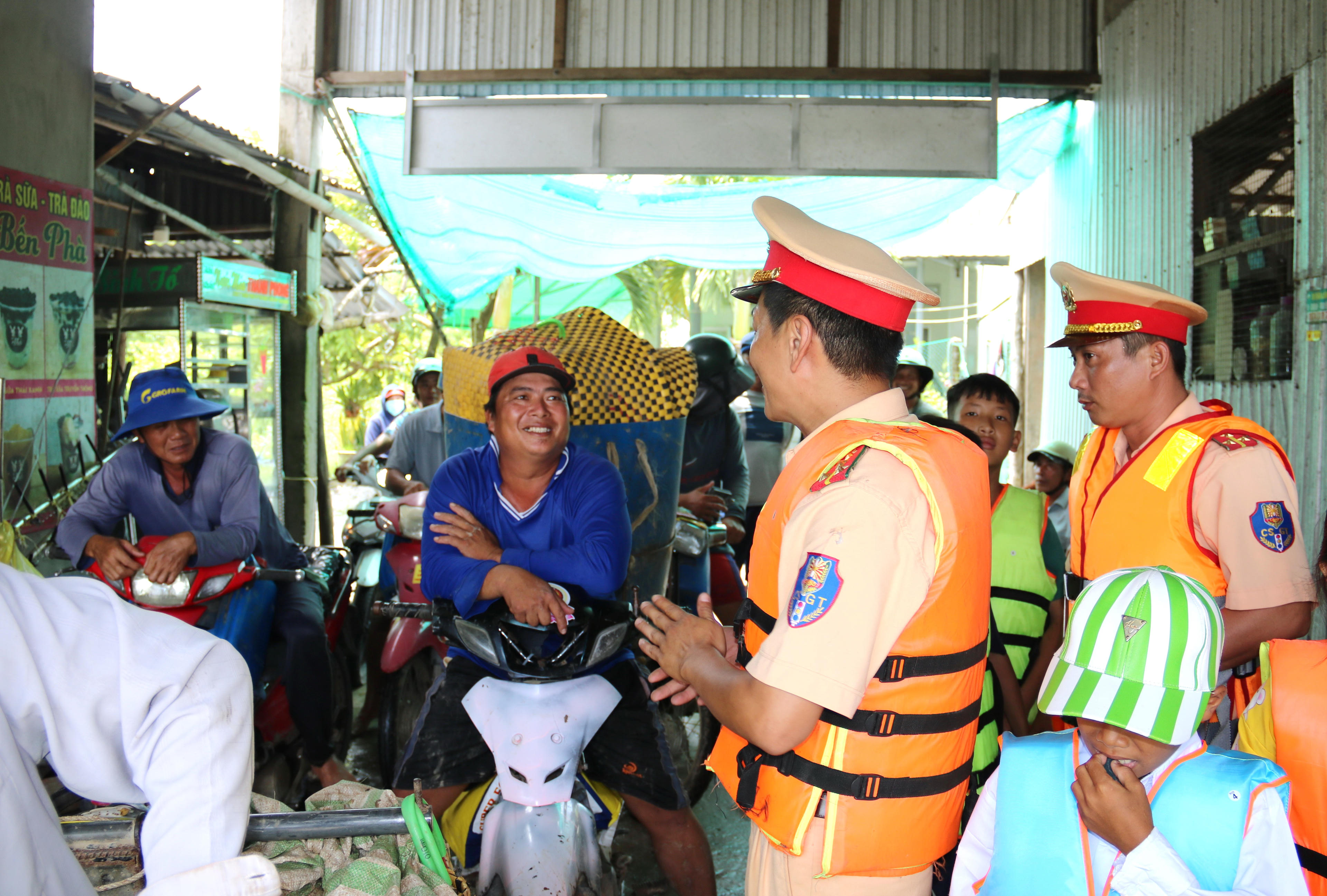 Cảnh sát giao thông Bạc Liêu phát tờ rơi tuyên truyền pháp luật về giao thông đường thủy nội địa. |