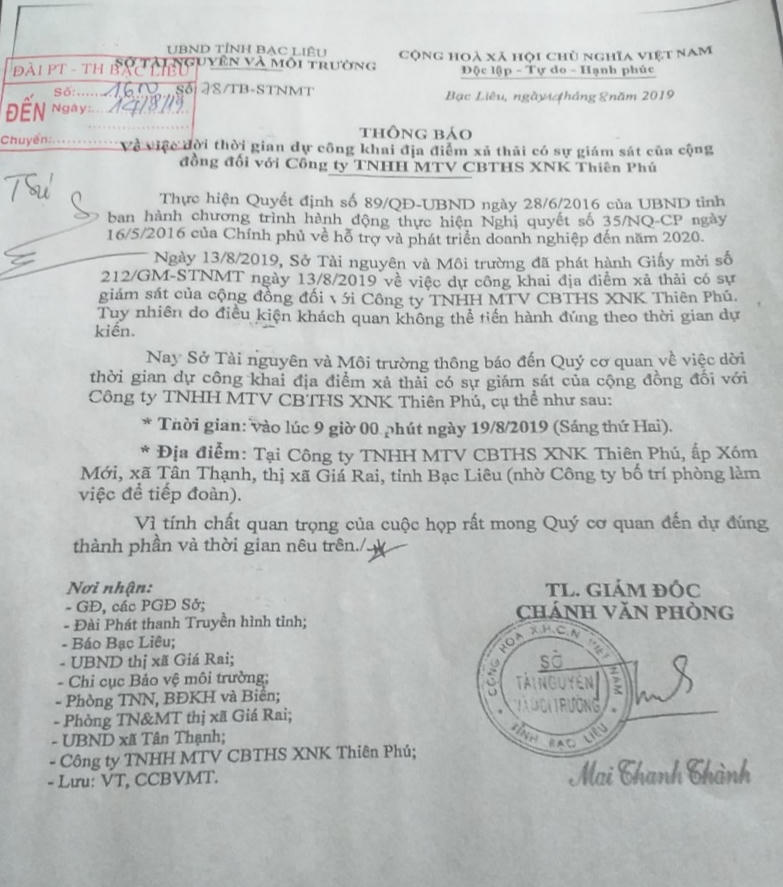 Ngoài Công ty Thiên Phú, Sở TN&MT Bạc Liêu còn tổ chức cắm biển xã thải công khai tại Công ty NIGICO chuyên về chế biến xuất khẩu thủy hải sản đóng trên địa bàn thị xã Giá Rai.