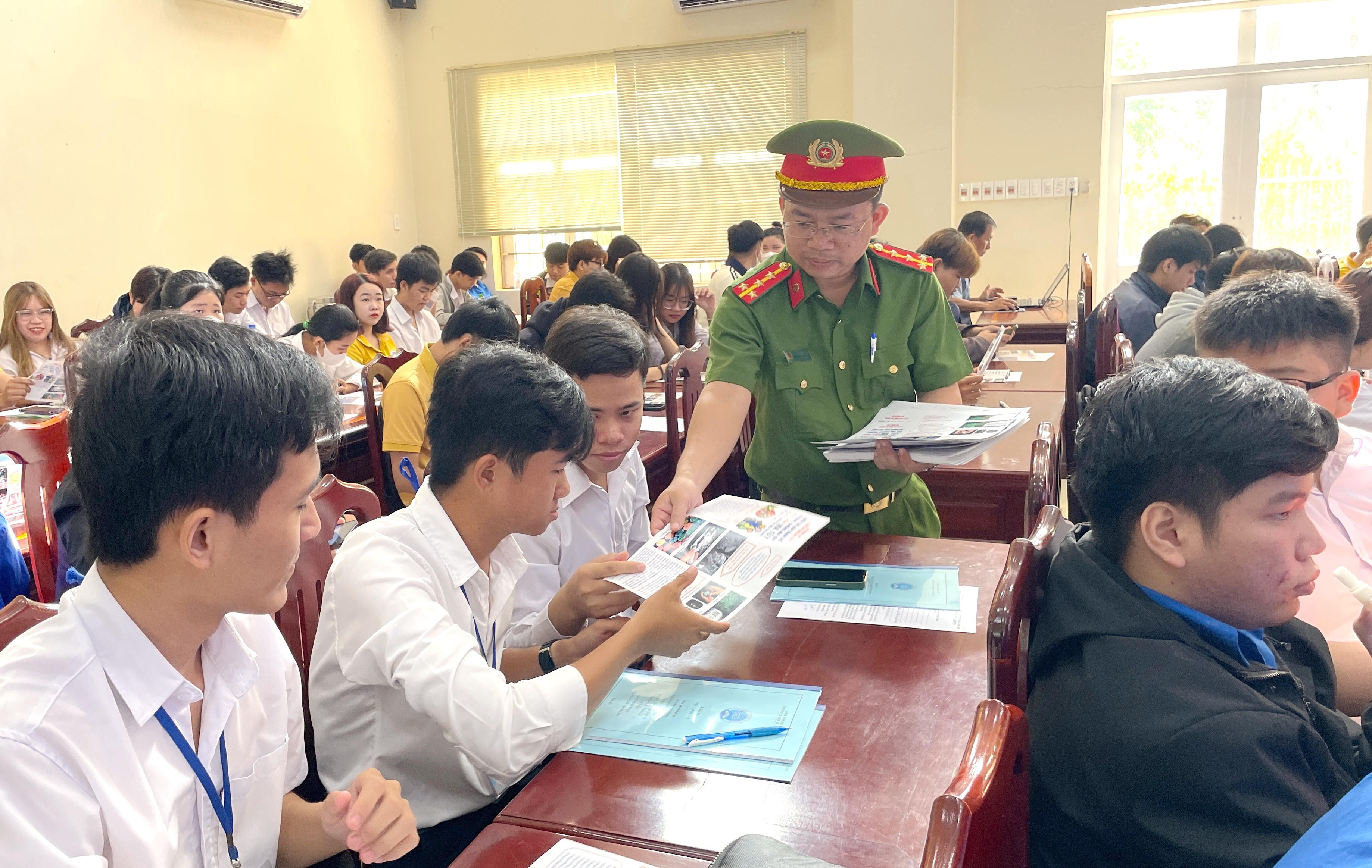 Lực lượng Công an Bạc Liêu phát tờ rơi tuyên truyền phòng, chống ma túy trong học sinh, sinh viên. |