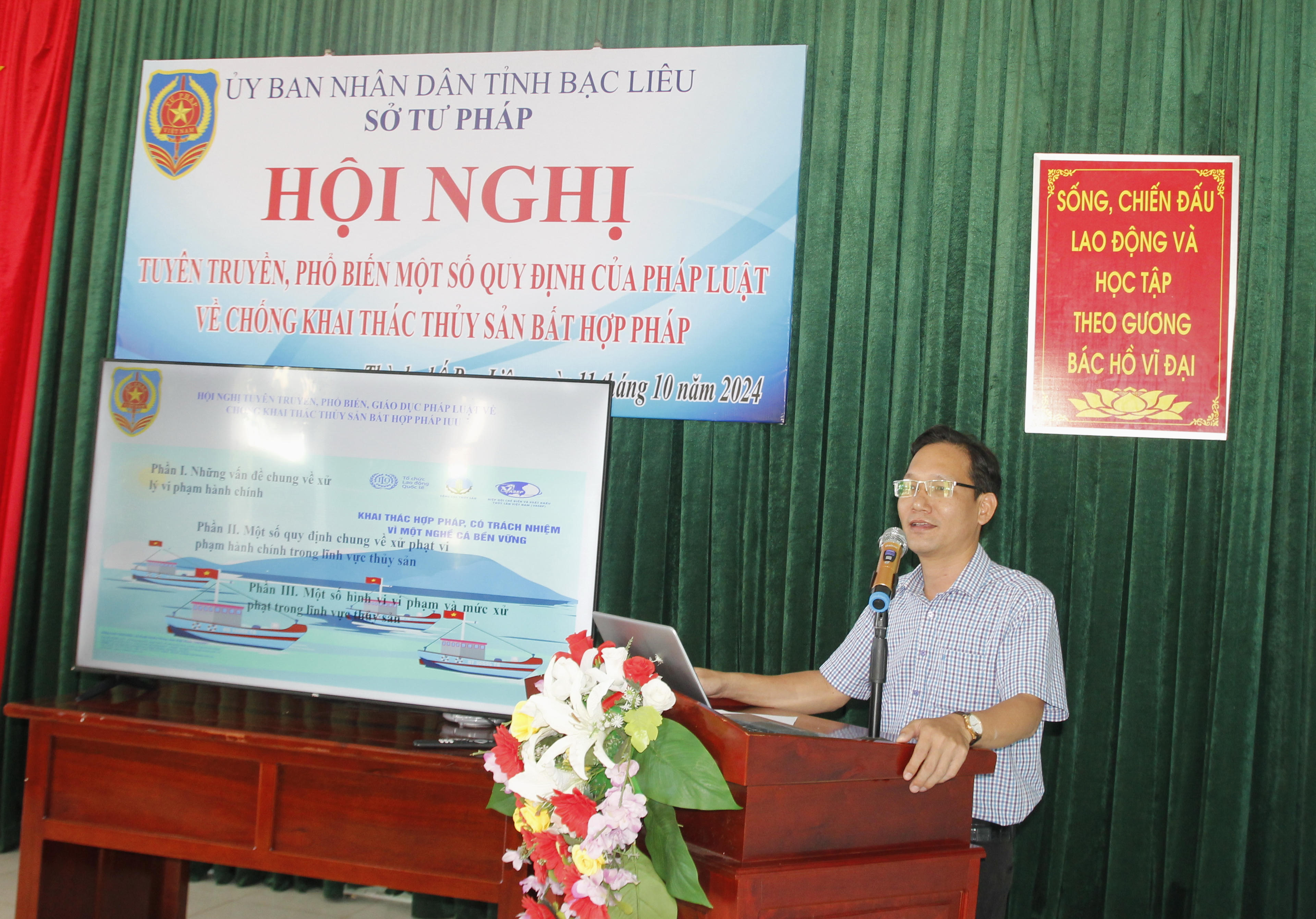 Phát biểu tại Hội nghị, ông Trần Minh Đức - Phó Giám đốc Sở Tư pháp Bạc Liêu, đề nghị các đơn vị phối hợp chặt chẽ, phương pháp tuyên truyền theo hướng tiếp cận sát đối tượng, đáp ứng nhu cầu của đối tượng... Đồng thời, thông qua các phương tiện thông tin đại chúng (báo chí, truyền thanh) để công tác tuyên truyền chống khai thác thủy sản trái phép IUU thực sự có hiệu quả để nâng cao nhận thức, ý thức chấp hành pháp luật trong khai thác thủy sản của chủ tàu cá và ngư dân”.