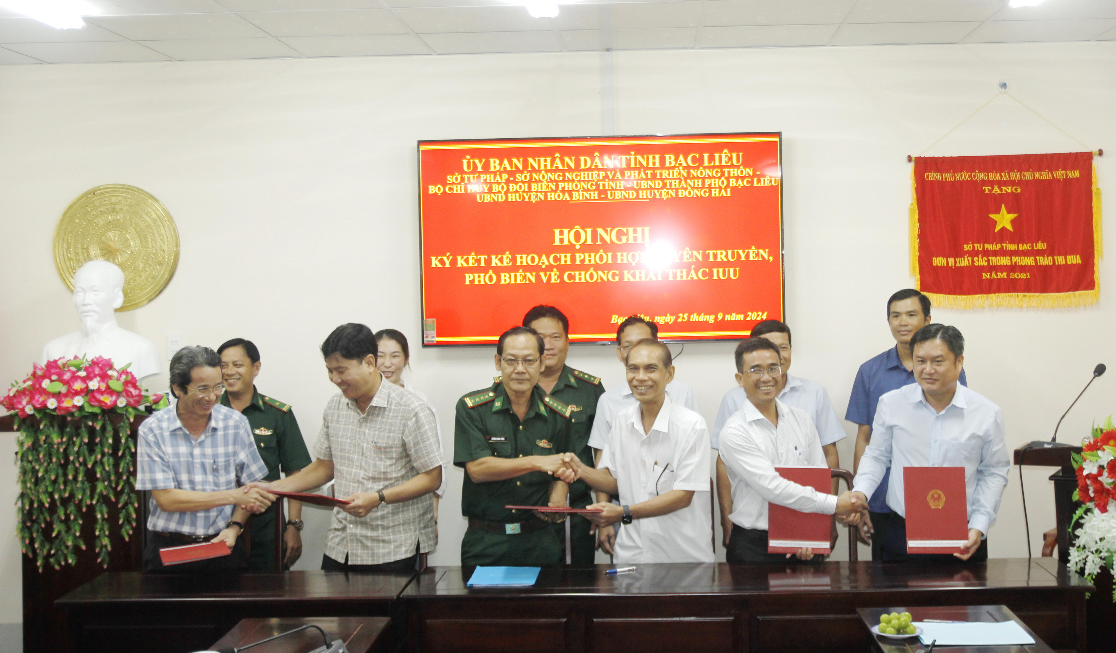 Trước đó, Sở Tư pháp Bạc Liêu đã tổ chức Hội nghị ký kết Kế hoạch phối hợp Sở Nông nghiệp và Phát triển nông thôn, Bộ Chỉ huy Bộ đội Biên phòng, UBND thành phố Bạc Liêu, huyện Hòa Bình và huyện Đông Hải về tuyên truyền, phổ biến về chống khai thác IUU.