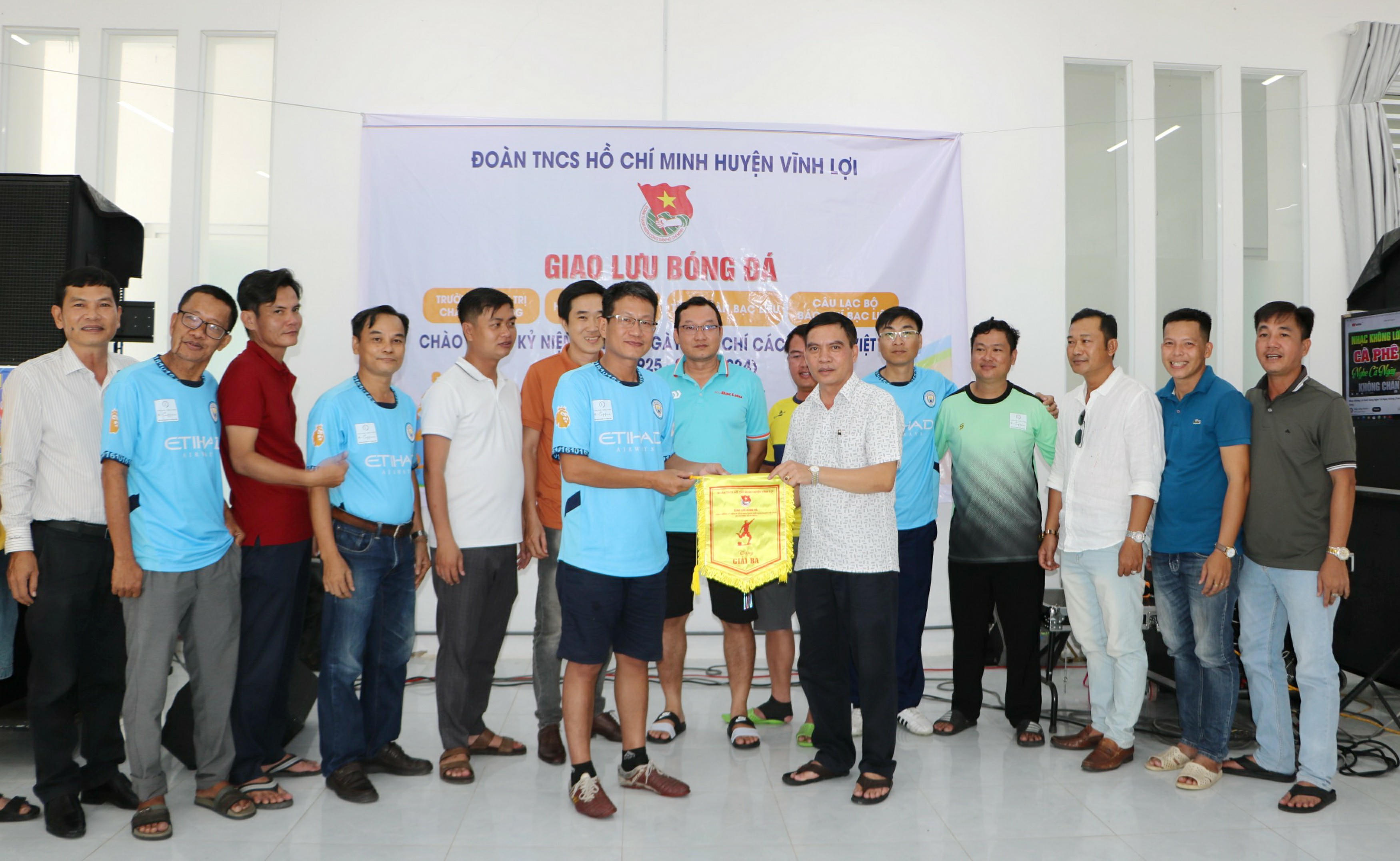 Ông Hà Phú Quí - Bí thư Huyện đoàn Vĩnh Lợi (tỉnh Bạc Liêu) trao cờ lưu niệm cho các đội bóng. |