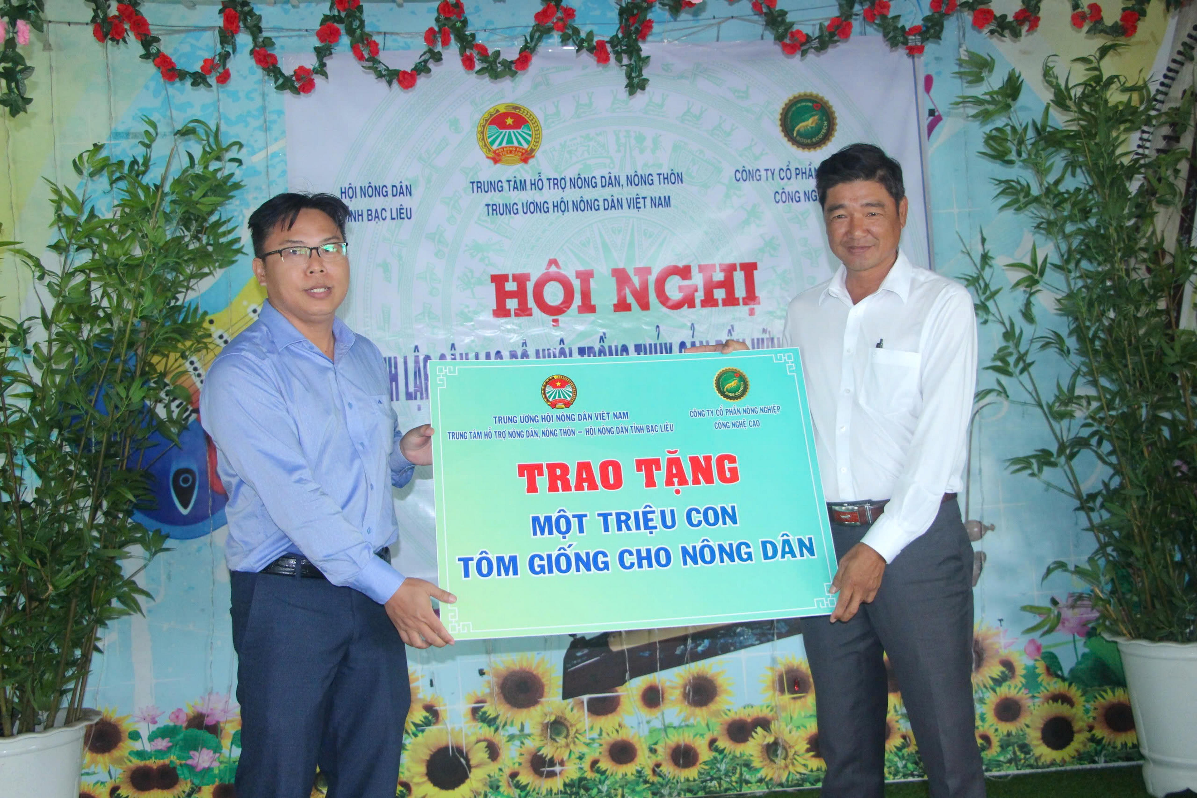 Đại diện các đơn vị trao tặng 1 triệu con tôm cho nông dân trên địa bàn tỉnh Bạc Liêu. |