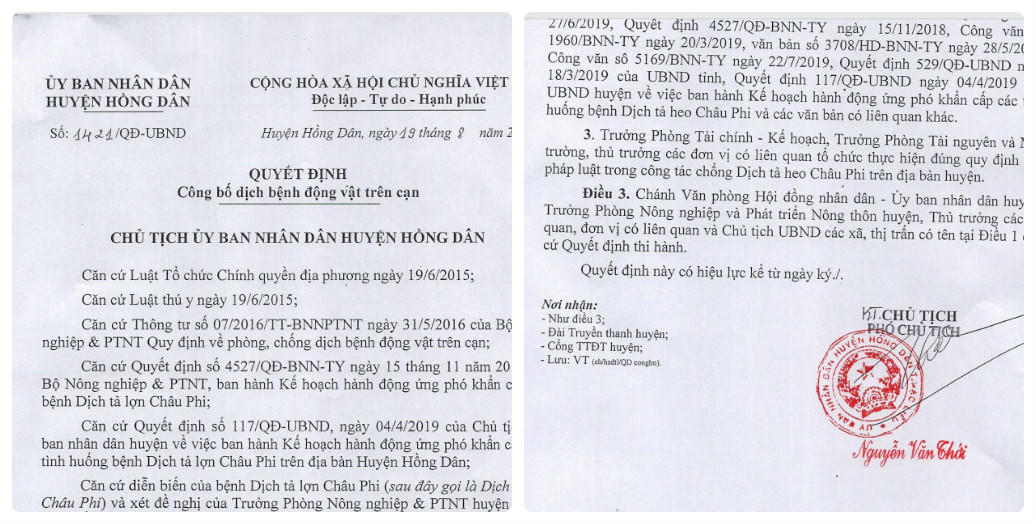 Ông Hà Văn Buôl cho biết, phát hiện các ổ dịch tả heo châu Phi từ ngày 7/8 nhưng phải 10 ngày sau UBND huyện Hồng Dân mới công bố dịch trên địa bàn. Lúc này, bệnh dịch đã lây lan ra hơn 170 hộ, với hơn 3.500 con mắc bệnh, ở hơn 40 khóm ấp, của 5 xã, thị trấn.