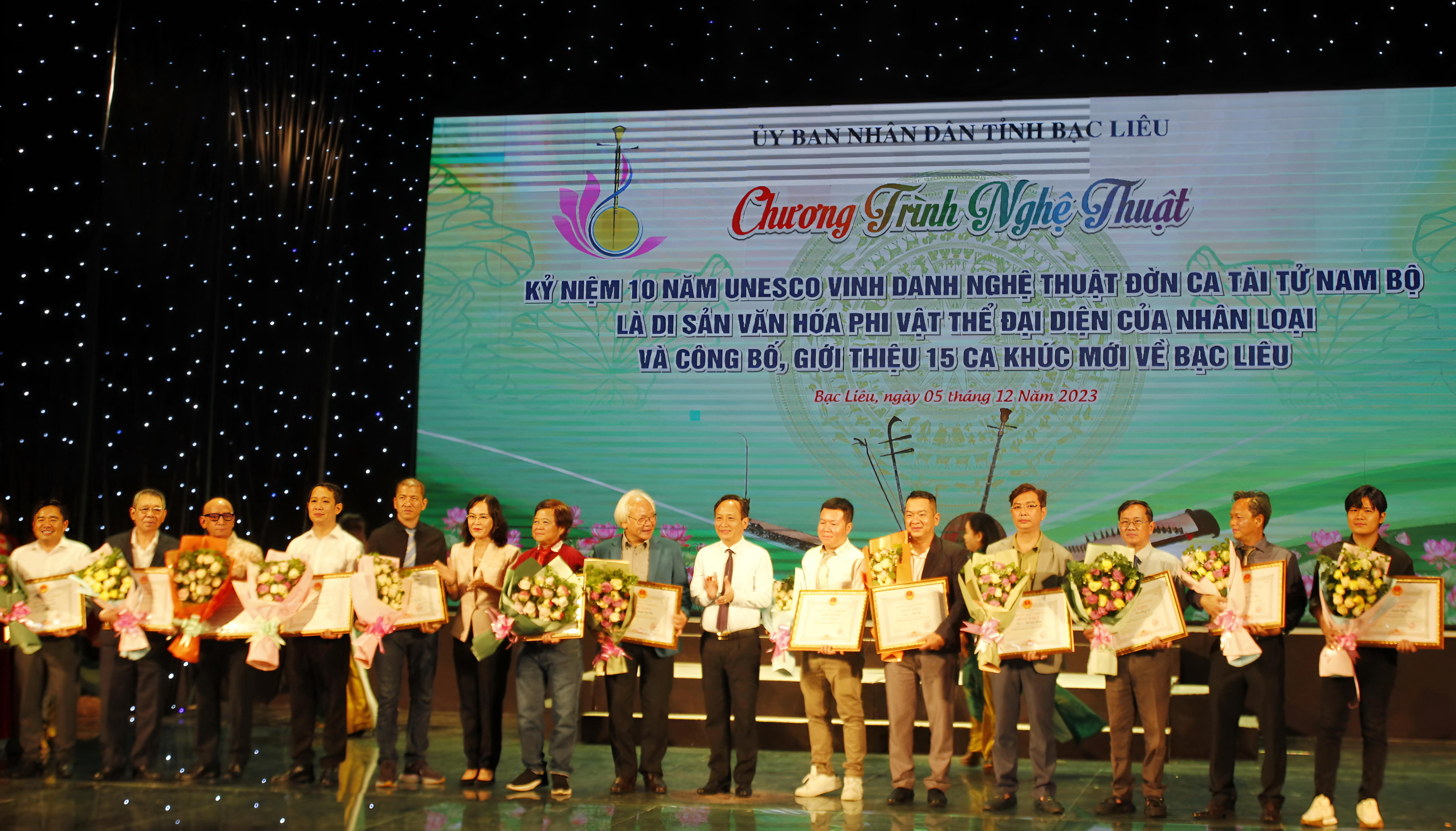 (PLVN) - Tối 5/12, tỉnh Bạc Liêu long trọng tổ chức Chương trình nghệ thuật kỷ niệm 10 năm UNESCO vinh danh Nghệ thuật Đờn ca tài tử Nam Bộ là Di sản văn hoá phi vật thể đại diện của nhân loại gắn với công bố, giới thiệu các sáng tác ca khúc mới về Bạc Liêu và trao giải Cuộc thi sáng tác chập cải lương, lời mới bản Đờn ca tài tử và vọng cổ về Phong trào Toàn dân đoàn kết xây dựng đời sống văn hoá, xây dựng nông thôn mới năm 2023.