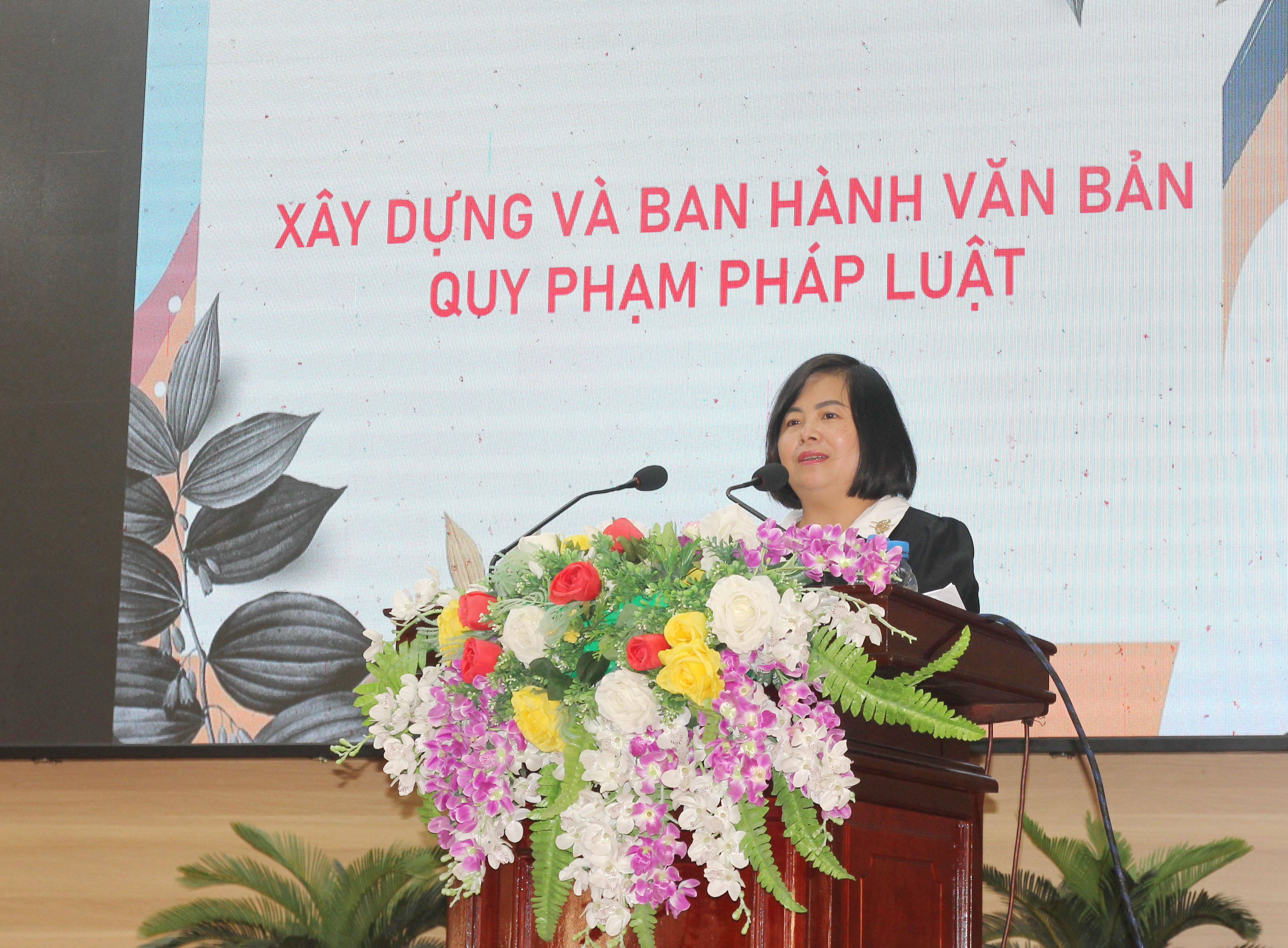 Báo cáo viên Bùi Thu Hằng, Trưởng phòng Công tác xây dựng pháp luật Vụ các vấn đề chung về xây dựng pháp luật (Bộ Tư pháp), giới thiệu điểm mới của Nghị định 59/2024/NĐ-CP sửa đổi, bổ sung một số điều của Nghị định 34/2016/NĐ-CP đã được sửa đổi, bổ sung một số điều, bởi Nghị định 154/2020/NĐ-CP như đẩy nhanh tiến độ xây dựng văn bản, đồng thời đảm bảo phù hợp với Luật ban hành văn bản quy phạm pháp luật (VBQPPL); bổ sung một số biểu mẫu trong xây dựng VBQPPL. Ngoài ra, các đại biểu được hướng dẫn quy trình soạn thảo VBQPPL các văn bản do UBND, HĐND cấp tỉnh, cấp huyện ban hành.