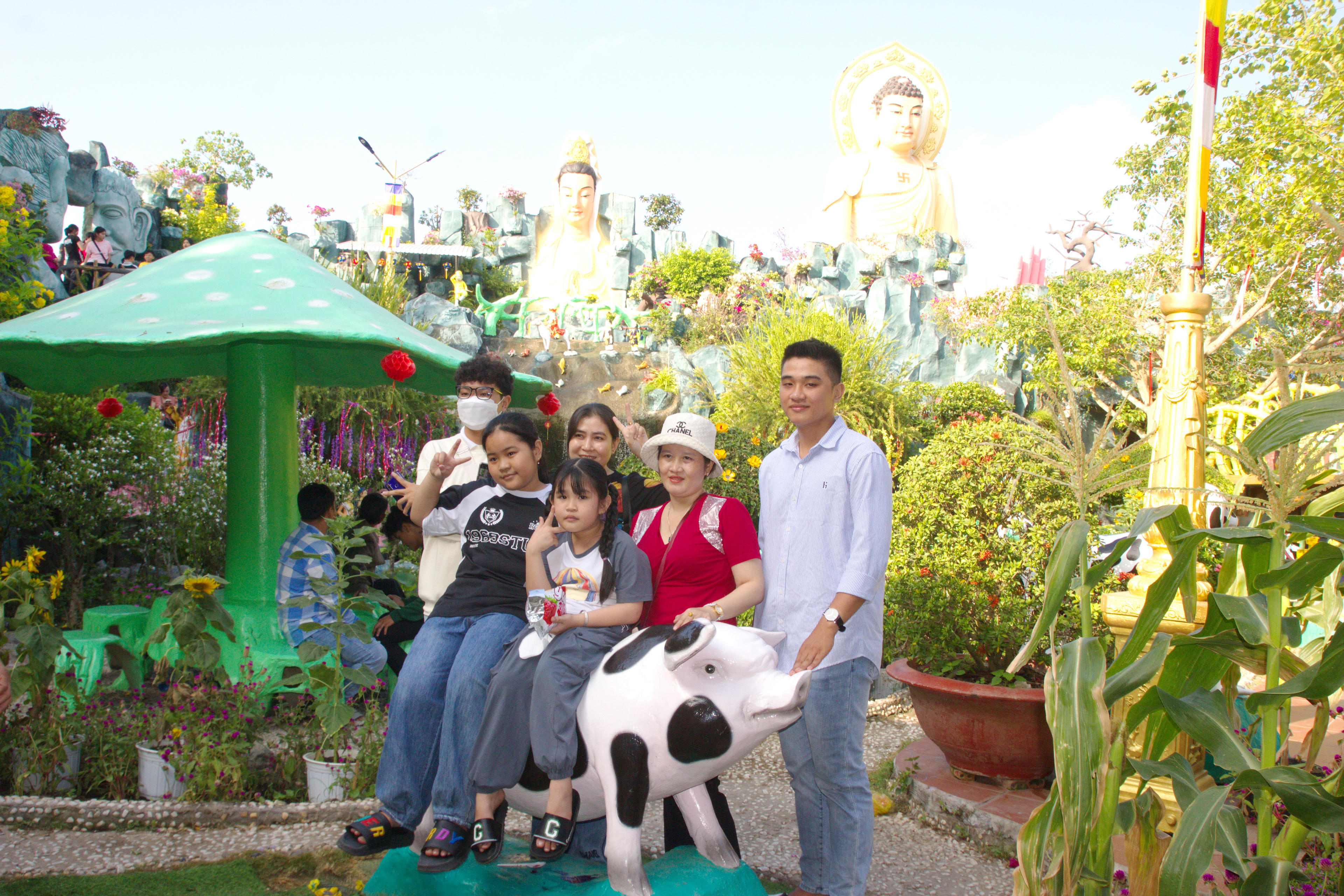 Du khách từ các nơi đổ về viếng chùa Giác Hoa (thị trấn Châu Hưng, huyện Vĩnh Lợi, tỉnh Bạc Liêu) để cầu may mắn, chụp ảnh trong năm mới. |