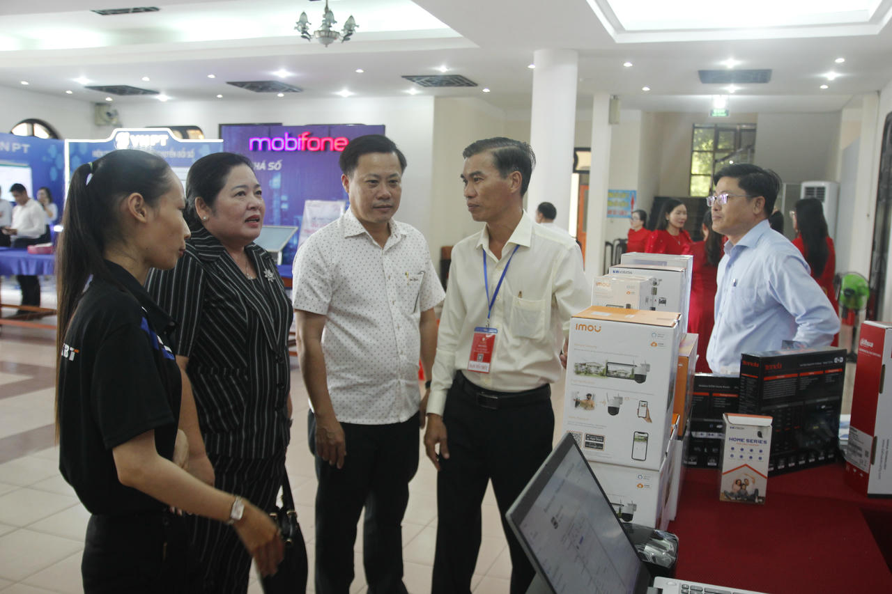 Ông Phạm Văn Thiều - Chủ tịch UBND tỉnh Bạc Liêu (thứ 2 hàng trên, từ trái sang) và lãnh đạo Sở, ban, ngành tham quan gian hàng trưng bày sản phẩm về Chuyển đổi số. |