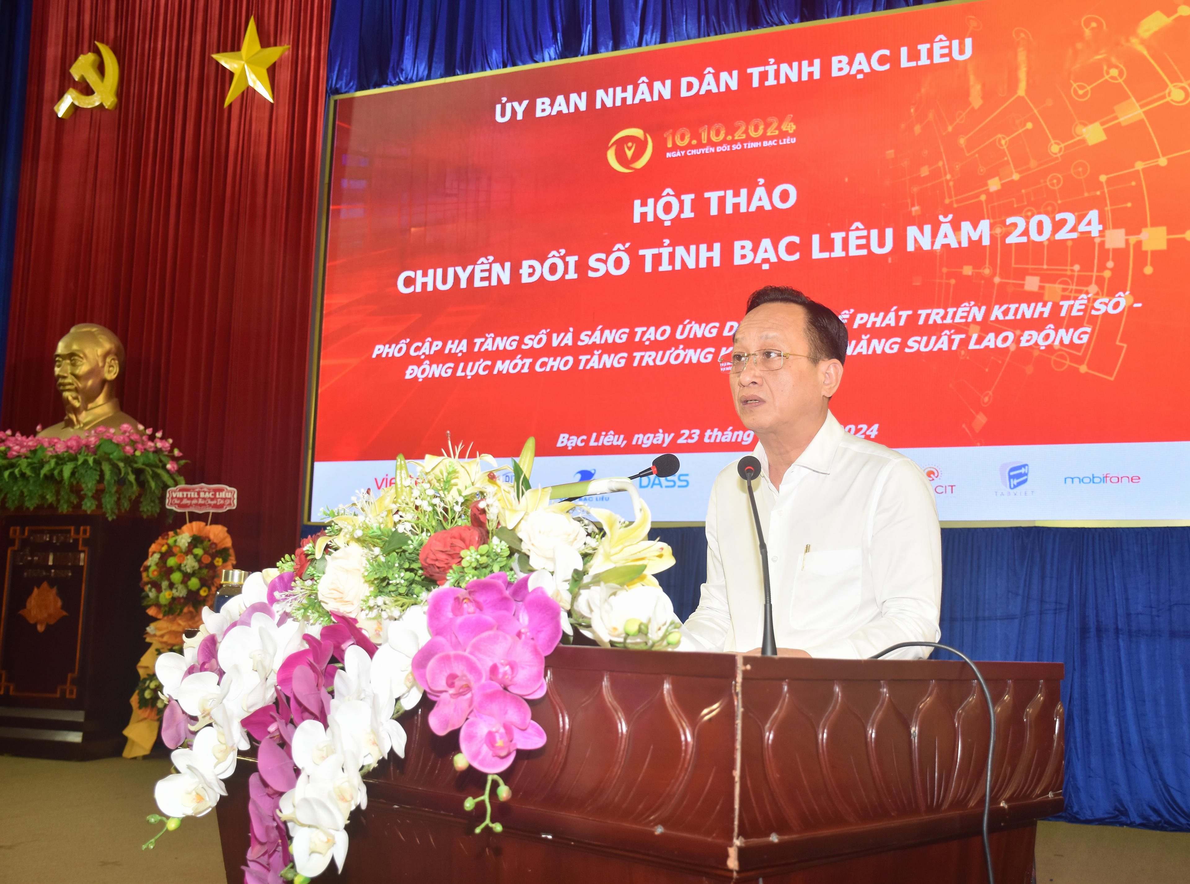 Tại Hội thảo, ông Phạm Văn Thiều - Phó Bí thư Tỉnh ủy, Chủ tịch UBND tỉnh, Trưởng Ban Chỉ đạo Chuyển đổi số tỉnh Bạc Liêu nhấn mạnh: Xác định tầm quan trọng, lợi ích to lớn mà Chuyển đổi số mang lại cho công tác chỉ đạo, điều hành, phát triển kinh tế - xã hội của các cấp chính quyền, sự phát triển của doanh nghiệp và phục vụ Nhân dân, tỉnh đã ban hành nhiều chủ trương, chính sách, chương trình, kế hoạch… Đồng thời, tỉnh đã chỉ đạo các Sở, Ban, ngành thực hiện cụ thể hóa các nhiệm vụ tại Chỉ thị 07 của Ban Thường vụ Tỉnh ủy về chuyển đổi số tỉnh từ nay đến năm 2025 và định hướng đến năm 2030, đề ra các chương trình, kế hoạch, đề án của UBND tỉnh về Chuyển đổi số. Từ đó, tỉnh đạt được một số kết quả quan trọng, tạo nền tảng, động lực cho công cuộc Chuyển đổi số của địa phương, dựa trên 3 trụ cột Chính quyền số, Kinh tế số và Xã hội số.