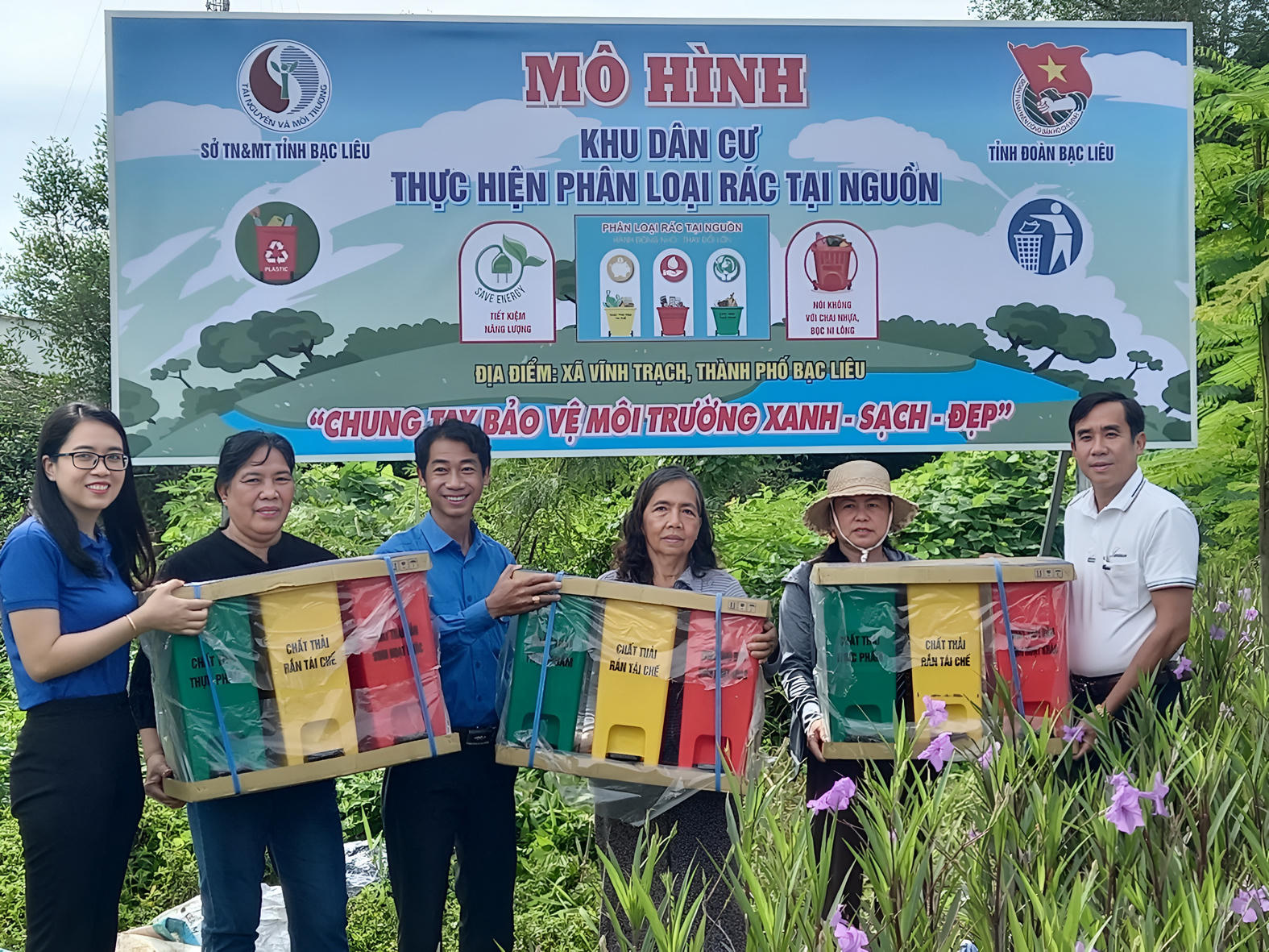 Lãnh đạo Sở Tài nguyên và Môi trường tỉnh Bạc Liêu đồng tài trợ thùng rác để phân loại rác thải sinh hoạt tại nguồn tại địa phương. |
