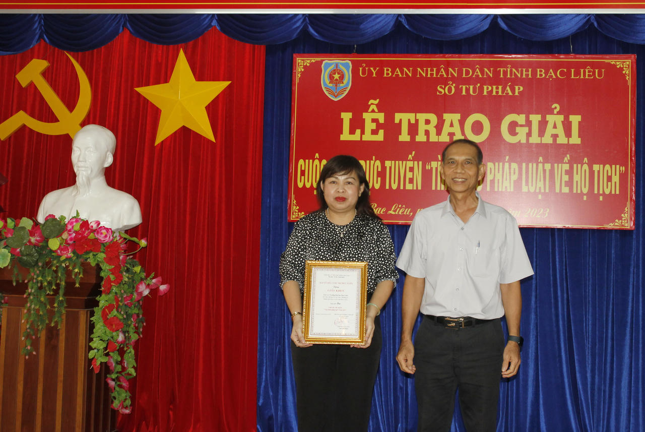 Ông Trần Minh Đức – Phó Giám đốc Sở Tư pháp Bạc Liêu trao giải Ba tập thể và giải Khuyến khích cá nhân. |