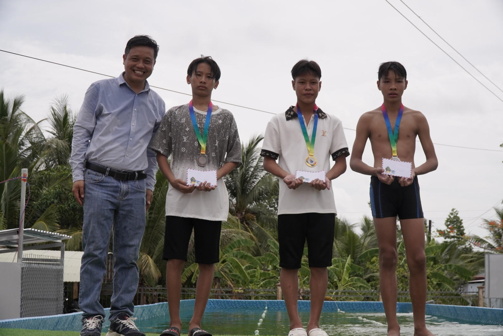 Trao giải cho các em giành chiến thắng trong cuộc thi bơi. Ảnh: Kim Ngân |