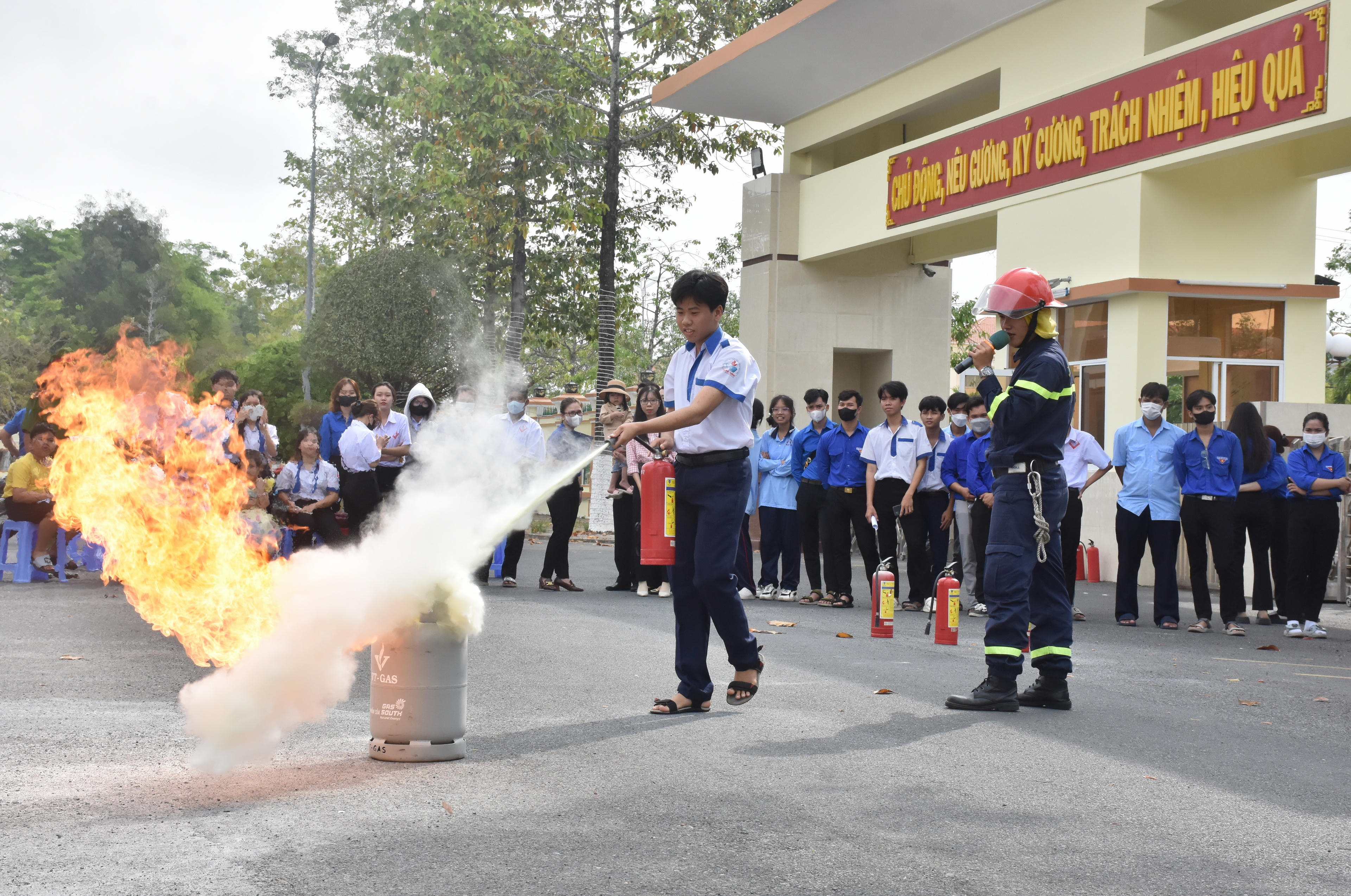 Các em học sinh được hướng dẫn, trải nghiệm cách sử dụng bình chữa cháy để dập lửa. |