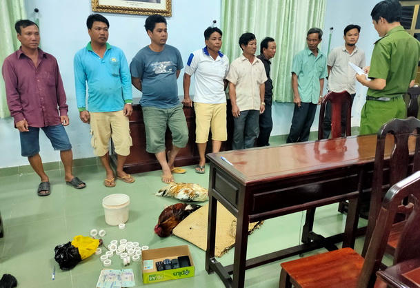 Các đối tượng bị tạm giữ để xử lý gồm có: Hồ Chí Phúc (sinh năm 1985), Bùi Tân Tiến (sinh năm 1977), Lâm Anh Thảo (sinh năm 1979), Hồ Văn Vũ (sinh năm 1954) cùng ngụ ấp Diêm Điền, xã Điền Hải, huyện Đông Hải; Huỳnh Vũ Trường (sinh năm 1982), Dương Văn Giàu (sinh năm 1979), Huỳnh Văn Đấu (sinh năm 1962), cùng ngụ ấp Bờ Cảng, xã Điền Hải, huyện Đông Hải, tỉnh Bạc Liêu và Nguyễn Văn Tùng (sinh năm 1989) ở huyện Thái Bình, tỉnh Cà Mau. Tang vật thu giữ gồm có 2 con gà trống, 2 xe mô tô, 6 điện thoại di động, gần 7,5 triệu đồng tiền mặt và các vật dụng khác có liên quan.