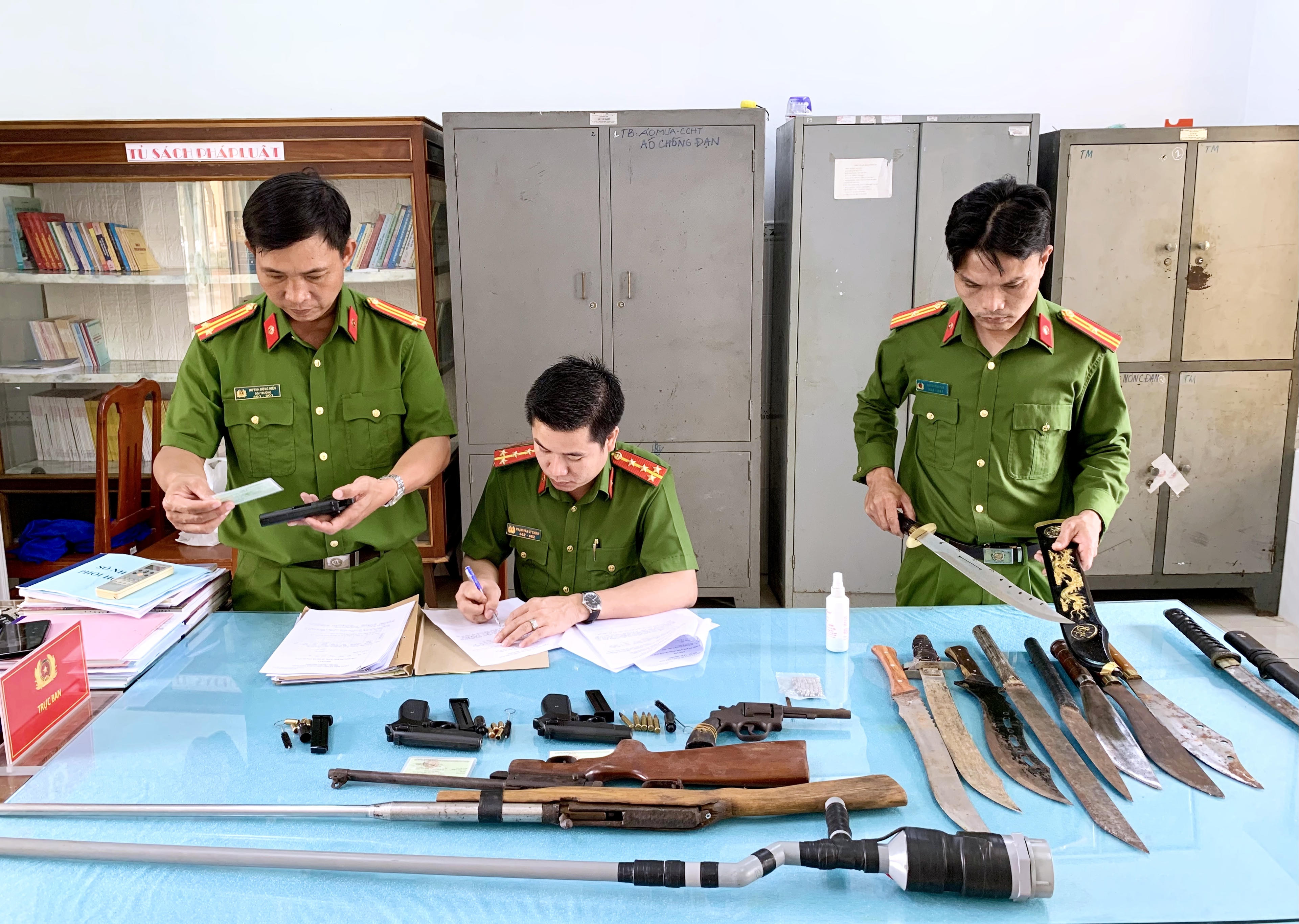 Cảnh sát hình sự Công an tỉnh đã tiến hành tuyên truyền, vận động để người dân nhận thức được việc tàng trữ, sử dụng các loại vũ khí, hung khí này là vi phạm pháp luật, qua đó đã tự nguyện giao nộp lại cho cơ quan Công an 5 khẩu súng, 11 viên đạn, 20 viên đạn bi sắt, 10 dao tự chế.