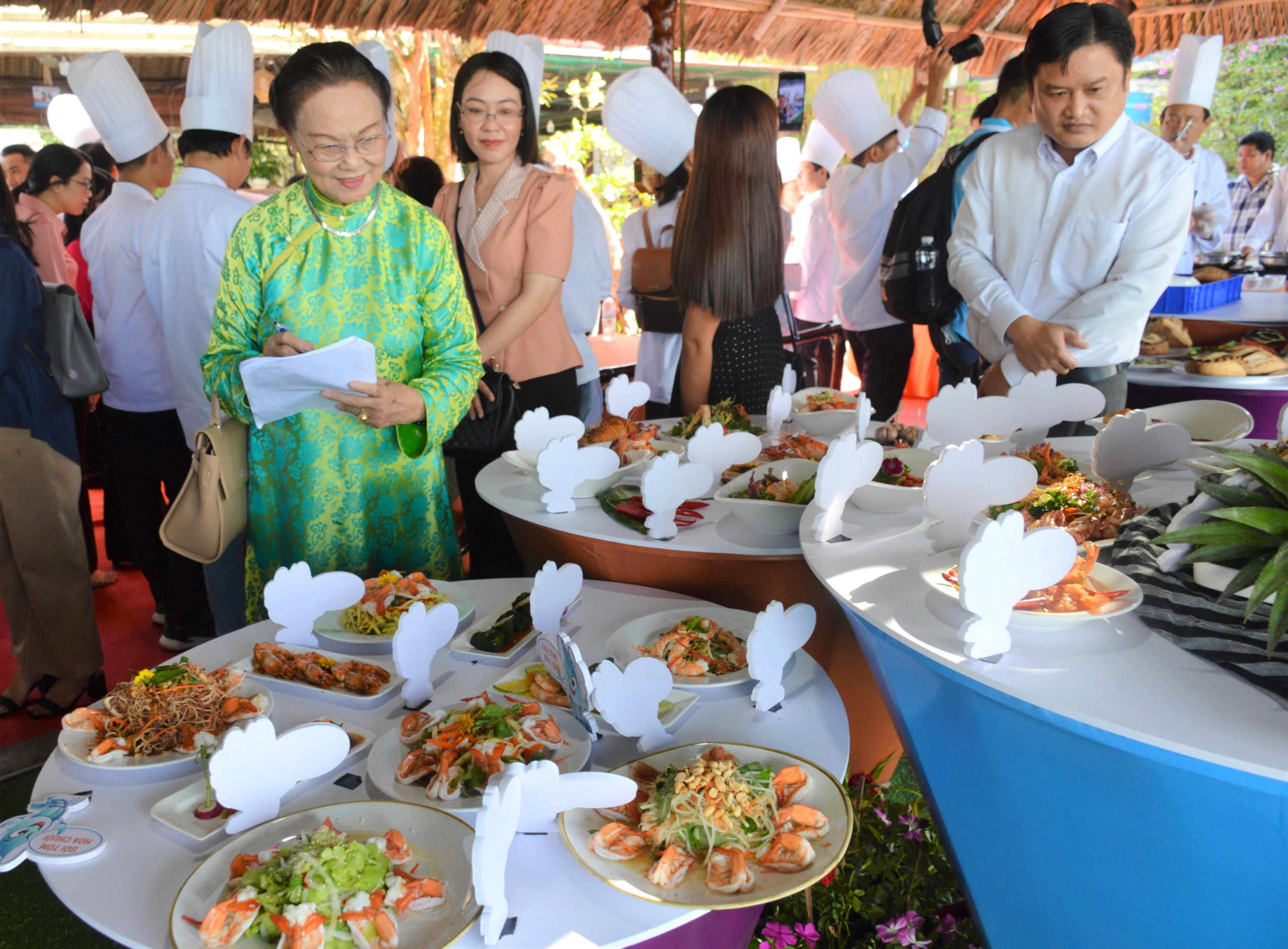 Ban Giám khảo chấm điểm cho các đội thi chế biến và trình diễn các món ăn từ tôm và muối Bạc Liêu. |