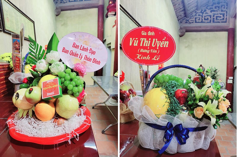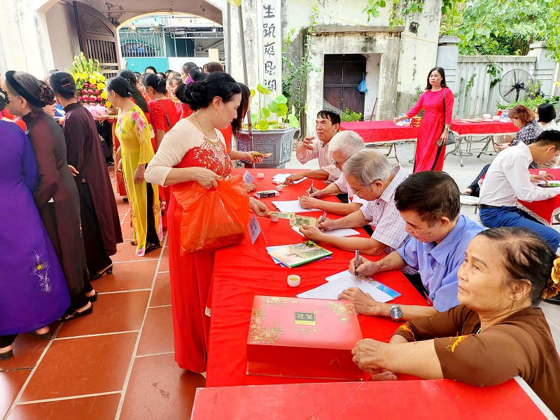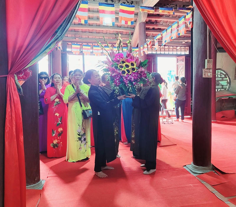Các Phật tử Chùa Đinh nhận mâm lễ mà người dân tới dâng |