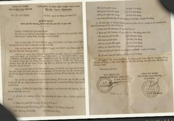 Ngày 21/11/2012, Cục Thuế tỉnh Bắc Ninh nhận được đơn đề nghị trừ tiền bồi thường vào tiền thuê đât số 52/CV-TNĐT ghi ngày 12/10/2012, kèm theo Quyết toán kinh phí bồi thường, hỗ trợ khi thu hồi đất và giao đất số 65/CV-TNĐT ngày 08/11/2012 có xác nhận của Sở Tài chính Bắc Ninh với số liệu Quyết toán cụ thể. Trong đó Công ty TNHH Tín Nghĩa Đại Thành đã bồi thường hết toàn bộ 6.078.8m2, trong đó bao gồm cả phần diện tích 359.8m2 của gia đình ông Nguyễ Thế Du.