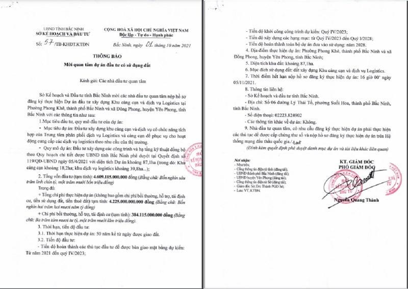 Thông báo của Sở Kế hoạch và Đầu tư Bắc Ninh. |