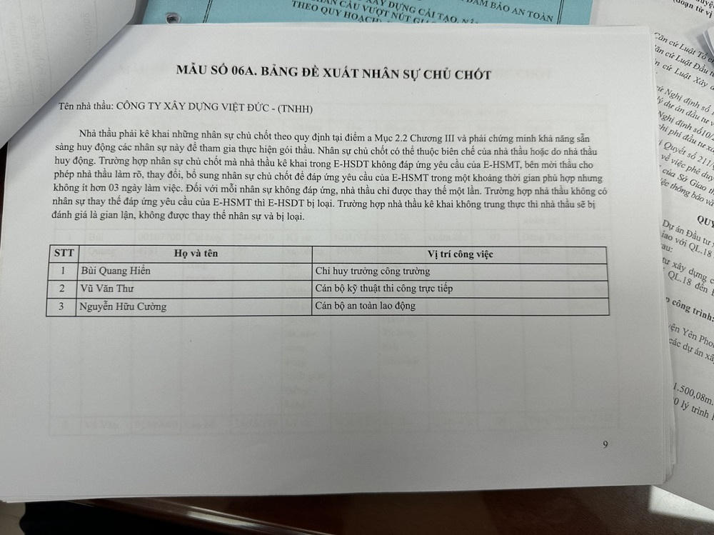 Căn cứ theo HSDT của Công ty xây dựng Việt Đức (TNHH) tại BQL các dự án xây dựng huyện Yên Phong, Công ty đề xuất ông Bùi Quang Hiển là Chỉ huy trưởng công trình, ông Vũ Văn Thư là cán bộ kỹ thuật thi công trực tiếp và ông Nguyễn Hữu Cường là cán bộ an toàn lao động. Tuy nhiên, trong biên bản số 01 chấp thuận nguồn vật liệu sử dụng vào công trình ngày 25/6/2023 lại thể hiện ông Vũ Cao Thái làm Chỉ huy trưởng công trình còn ông Nguyễn Thế Lâm là cán bộ phụ trách thi công trực tiếp?.