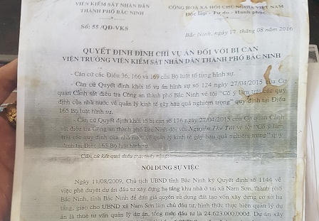 | Quyết định đình chỉ vụ án đối với bị can Nguyễn Thế Tài của Viện kiểm sát nhân dân thành phố Bắc Ninh khiến dư luận nghi ngờ có sự bao che cho tội phạm tham nhũng. |
