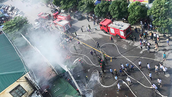 Đám cháy xuất phát từ một ki ốt trong đình chợ, khói bốc lên nghi ngút, vụ việc nhanh chóng được trình báo chính quyền và lực lượng chức năng. Cảnh sát PCCC được điều động với nhiều xe chữa cháy và hàng chục cảnh sát đến hiện trường khống chế ngọn lửa.