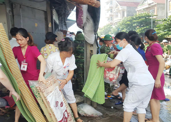 Các bác sĩ, cán bộ của bệnh viện này cũng dừng việc thăm khám, có mặt tại chợ sẵn sàng cứu nạn và giúp tiểu thương di tán hàng hóa ra bên ngoài.
