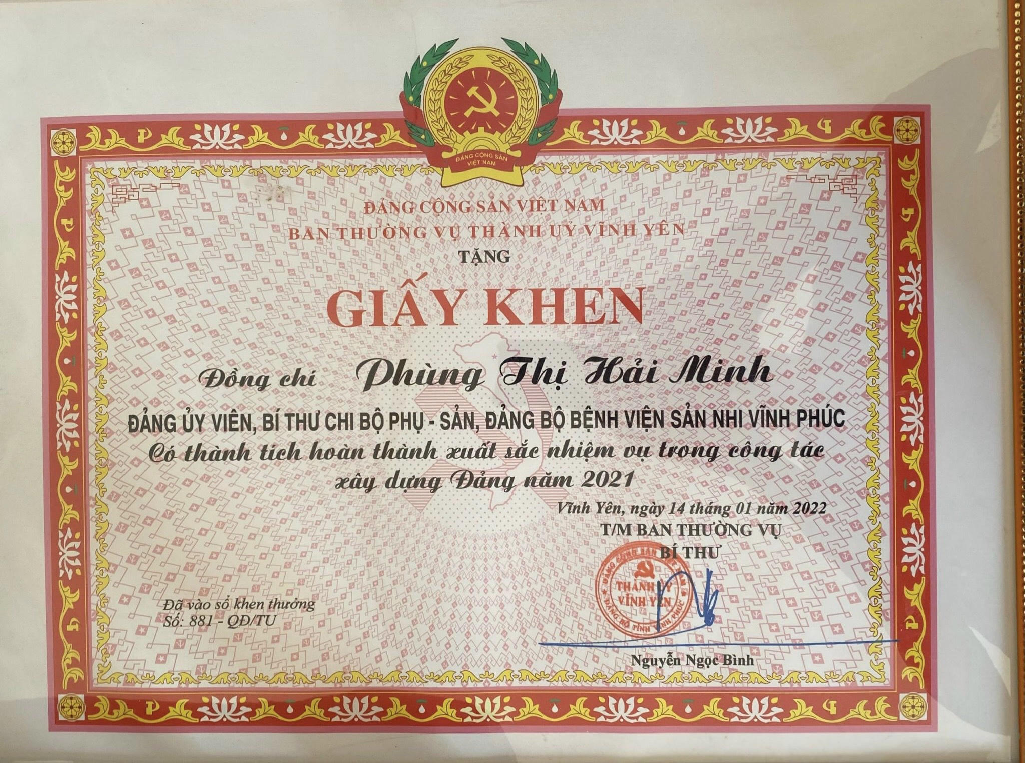 Bác sĩ Phùng Thị Hải Minh nhận giấy khen của Ban Thường vụ Thành ủy Vĩnh Yên |