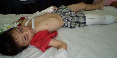 Cùng chung số phận không may mắn với bé Kim Ngân là thảm cảnh của bé Trần Văn Minh Hiếu (quận Bình Tân, TP.HCM) vừa xảy ra cách đây vài ngày. Theo đó, chỉ vì cầm điều khiển bấm ti vi liên tục gây tiếng ồn khiến bố dượng mất ngủ mà Hiếu bị người cha dượng độc ác này đánh cho bầm giập hết mặt mũi và gãy cả tay lẫn chân.