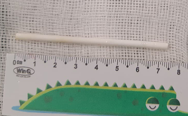 Kết quả chụp phim và siêu âm bụng cho thấy một dị vật hình ống thẳng áp sát thành dạ dày bệnh nhi. Các bác sĩ quyết định dùng một sợi dây thắt thành chiếc thòng lọng, nội soi buộc dây vào một đầu của dị vật hình ống rồi kéo ra ngoài. Sau nhiều nỗ lực, các bác sĩ đã thành công kéo ra ngoài chiếc que kẹo dài 7,5 cm. Sức khỏe bé trai ổn định sau thủ thuật.