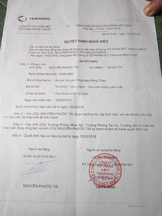 Khó khăn chưa dừng lại ở đó. Sau khi xuất viện, anh Tài cùng vợ trở về quê ngoại ở Nghệ An điều trị vật lý trị liệu phục hồi chức năng, với hi vọng có thể sớm trở lại làm việc, nhưng đột ngột, anh nhận được quyết định cho nghỉ việc ở công ty, đồng thời không nhận được tiền hỗ trợ vì tai nạn ngoài lao động.