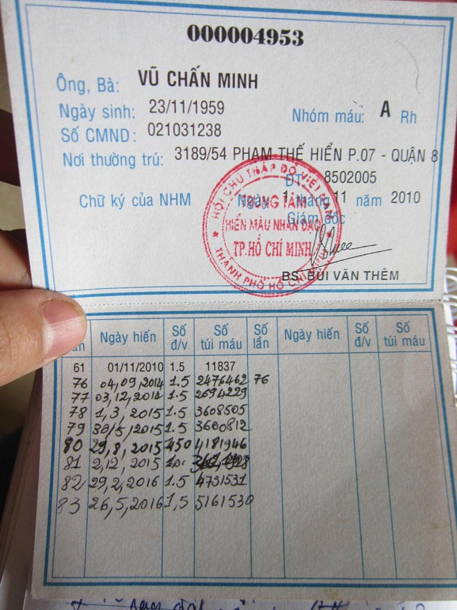 Từ đó đến nay, ông Minh là hội viên của Trung tâm Hiến máu nhân đạo TP HCM, đồng thời là hội viên của đội hiến máu dự bị (thuộc ngân hàng máu sống trên địa bàn quận 8).