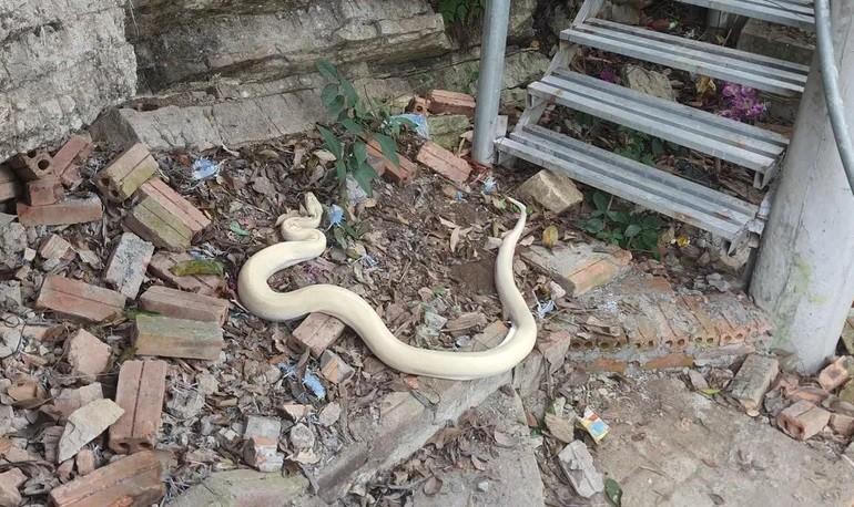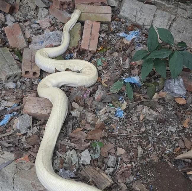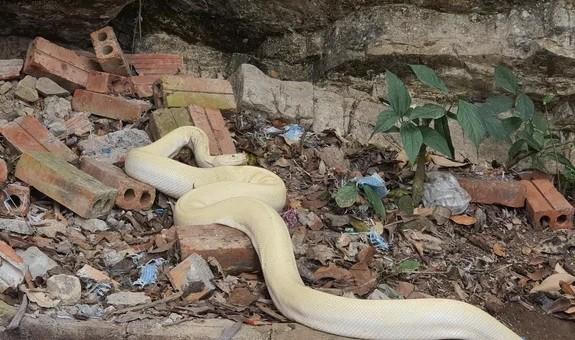 Con trăn này dài khoảng 3m, nặng trên chục ký và là loại trăn bạch tạng hiếm thấy trong tự nhiên. Dù rất nhiều người tò mò kéo đến quan sát nhưng con trăn này vẫn nằm im, không có dấu hiệu tấn công một ai.