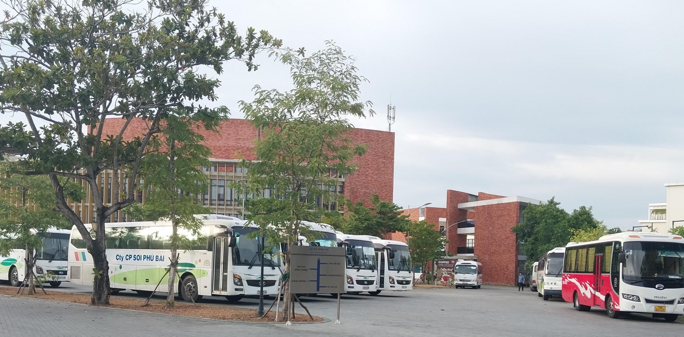 Những chiếc xe đưa đón công nhân đậu trong khuôn viên Học viện Âm nhạc Huế. (Hình chụp ngày 27/7) |