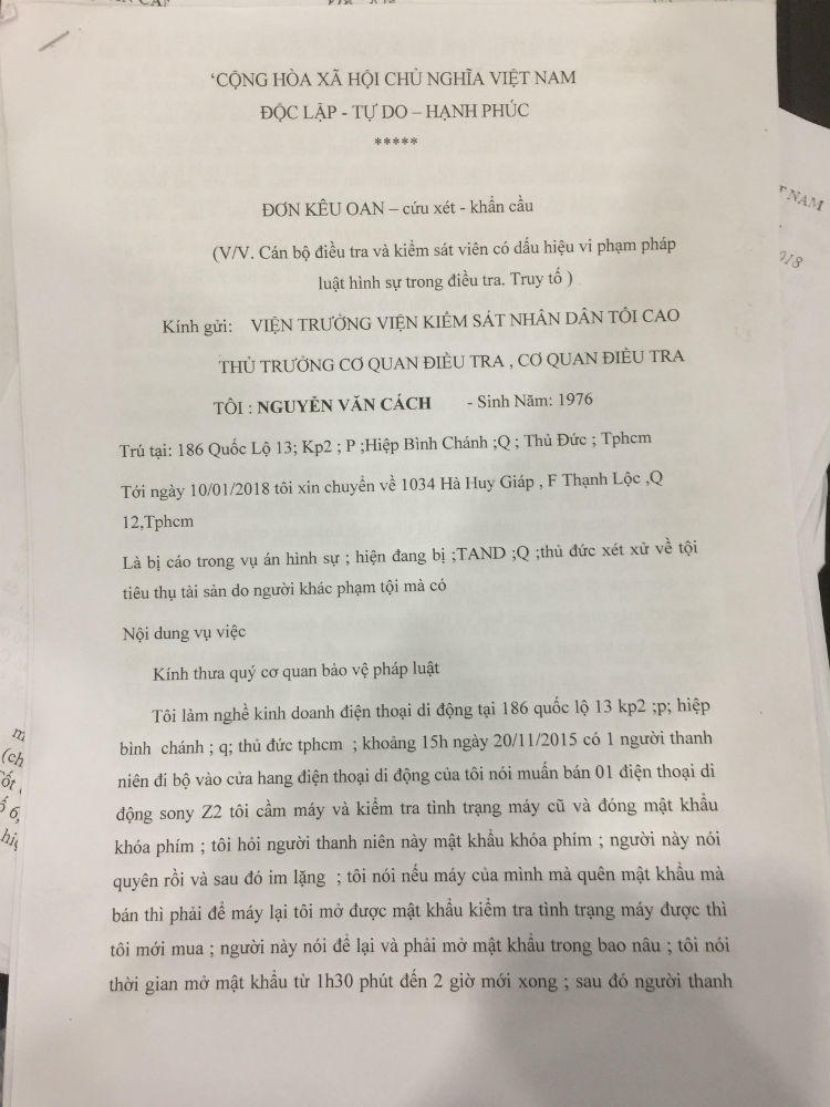 Ông Nguyễn Văn Cách (SN 1976, ngụ quận 12, TP HCM) có đơn kêu oan đến cơ quan chức năng về việc ông bị các cơ quan tố tụng quận Thủ Đức (TP HCM) truy tố xét xử về tội “Tiêu thụ tài sản do người khác phạm tội mà có”.