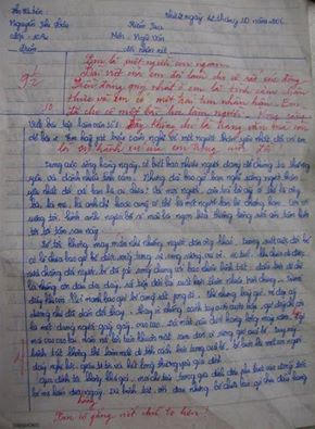 Nguyễn Thị Hậu - học sinh chuyên Toán lớp 10A2 THPT Huỳnh Thúc Kháng, thành phố Vinh, Nghệ An - chỉ có 45 phút ngồi trên lớp học để viết lên bài văn này. Bài văn với gần 1.500 từ trên 4 trang giấy kiểm tra ướt nhoè nước mắt của Hậu khi làm bài.