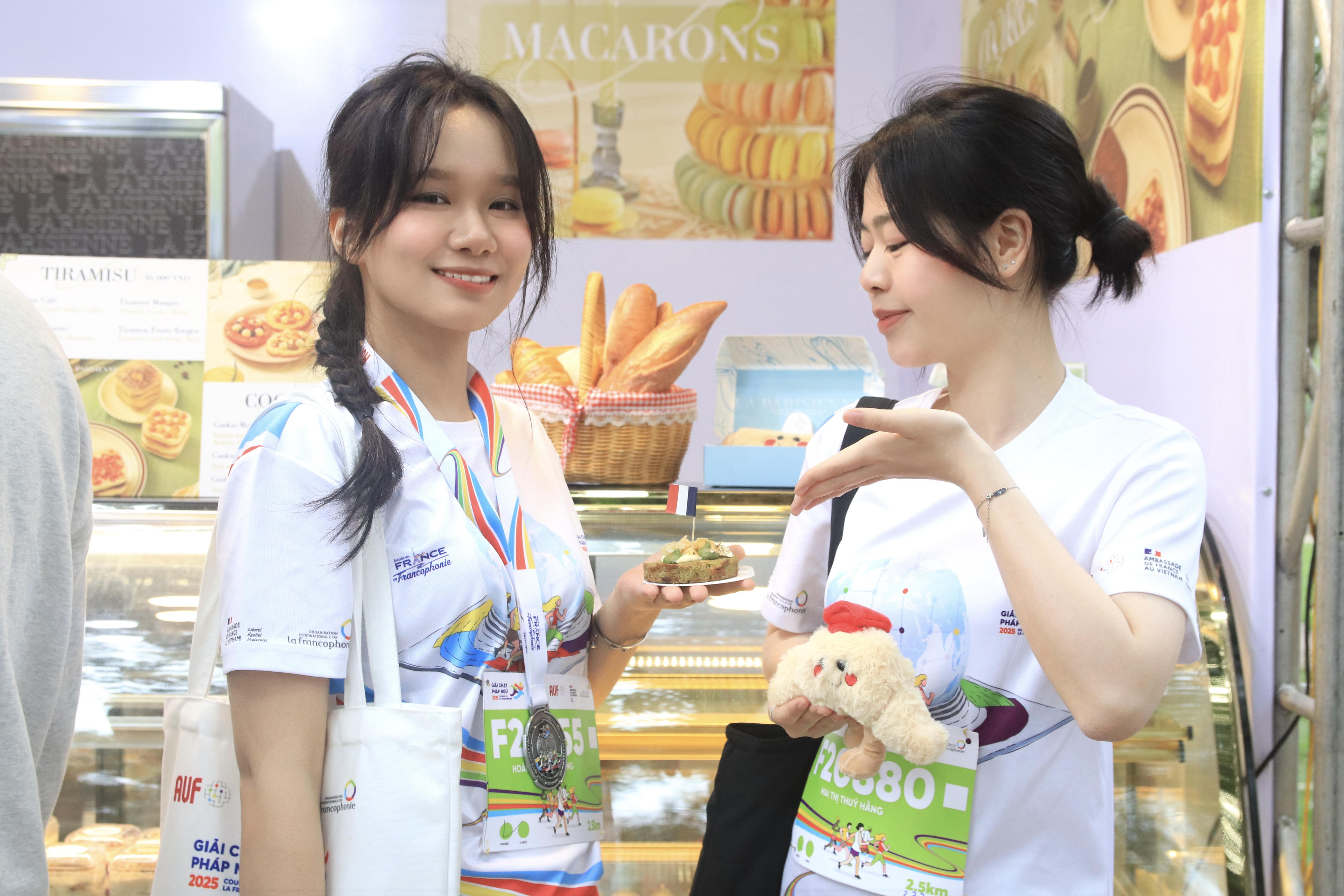 Vừa hoàn thành đường chạy của Giải Pháp ngữ buổi sáng, đôi bạn Hoàng Thị Mai Hương và Mai Thị Thuý Hằng (20 tuổi, sinh viên Đại học Luật Hà Nội - HLU) không giấu được sự hào hứng khi hòa mình vào không gian ẩm thực đặc sắc của Balade en France, nơi họ tìm thấy sự kết nối với tình yêu văn hóa Pháp của mình.