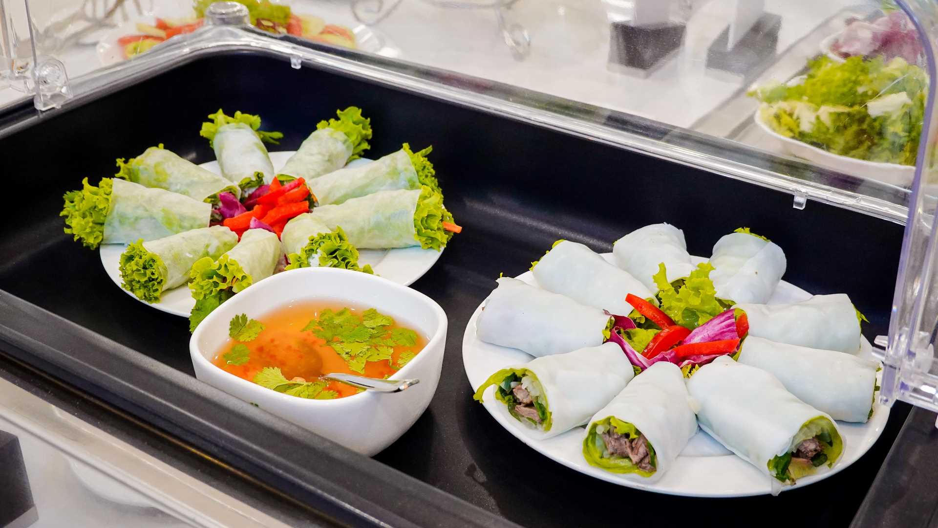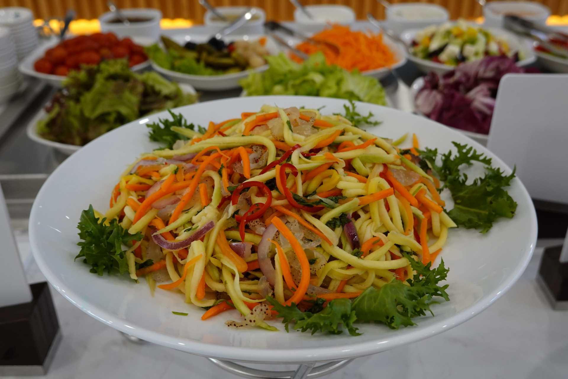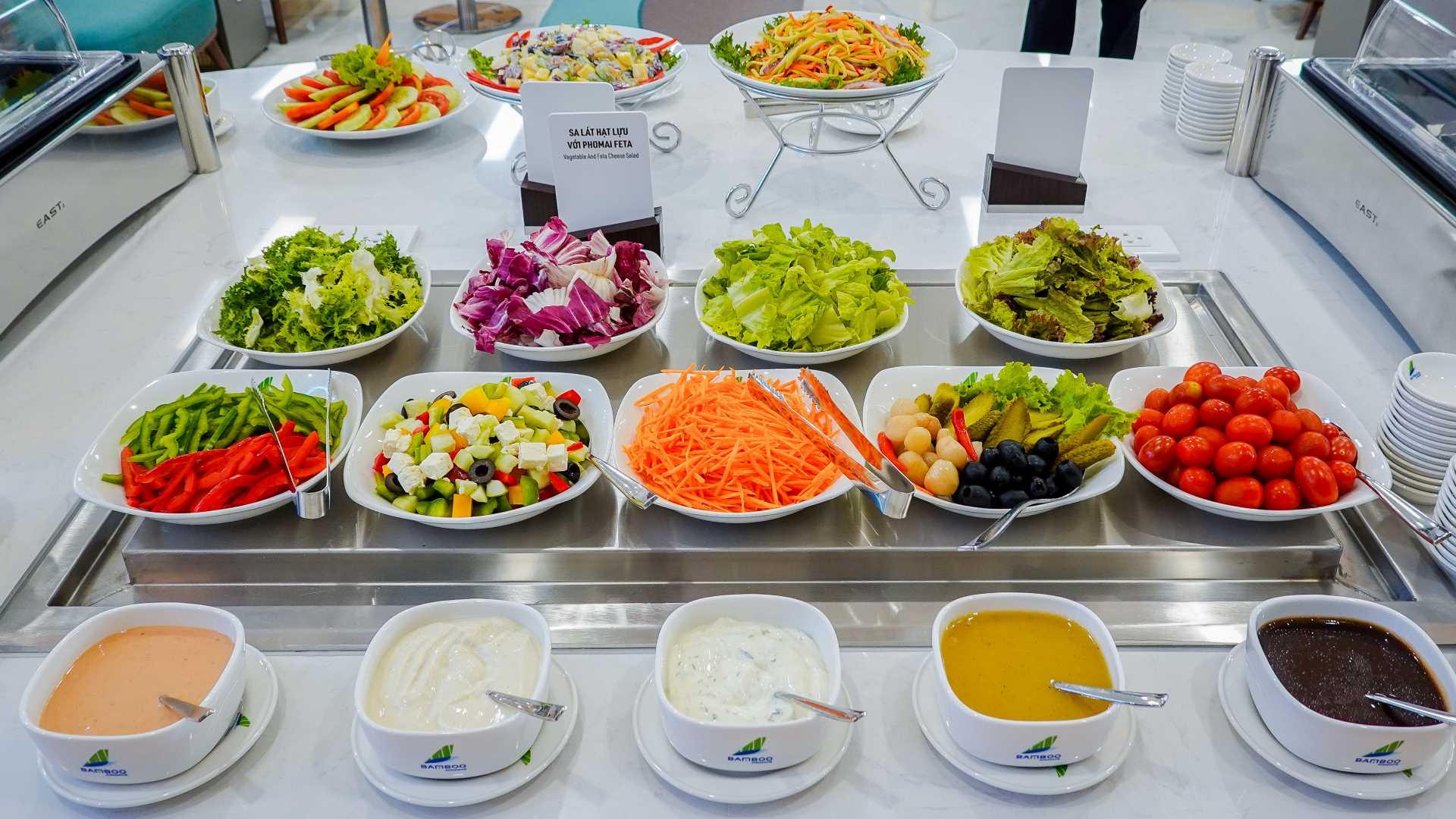Số lượng món ăn phong phú và đa dạng kết hợp phong vị truyền thống với tinh hoa ẩm thực Âu - Á mang đến cho hành khách nhiều sự lựa chọn, hứa hẹn chinh phục những thực khách sành ăn. Theo đó, buffet đầy đủ các món ăn từ khai vị, soup, món chính nguội và nóng, đồ tráng miệng đặc sắc... Danh sách đồ uống phong phú đáp ứng nhiều nhu cầu thưởng thức. Khâu chọn nguyên liệu khắt khe, đảm bảo tiêu chí sạch, an toàn, có lợi cho sức khỏe.