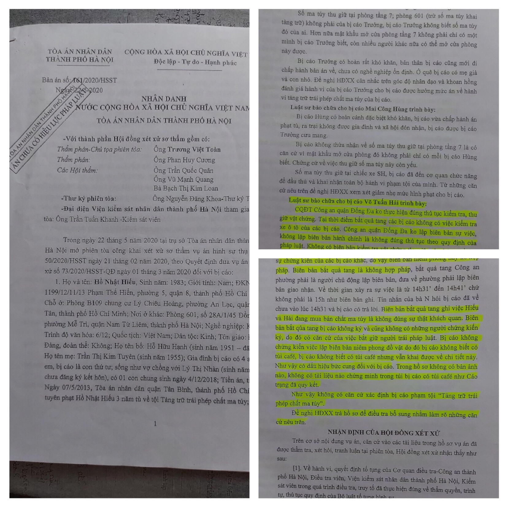 Mặc dù vậy, bản án sơ thẩm 161/2020/HSST ngày 22/5/2020 của TAND TP Hà Nội vẫn xác định đủ căn cứ kết tội và tuyên phạt Hồ Nhật Hiếu và Vũ Quốc Trưởng cùng mức án tử hình về tội “Mua bán trái phép chất ma túy”; Mai Công Hùng mức chung thân, Võ Tuấn Hải 20 năm tù cùng về tội “Tàng trữ trái phép ma túy”.